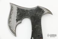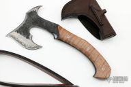 This San-Mai Hand Axe by the Sobral Brothers features a hammer mark finished black blade head with spike at the rear, stainless steel fittings, micarta liners wood scales. Full tang construction .286" stock and 1.70" blade depth. 5.25" from blade to tip of spike. 11.25" overall. Comes with a leather sheath with shoulder rig, updated sheath from Sobrals and a zippered case. New from Maker! Original two-piece sheath might be split, but is included.