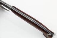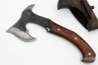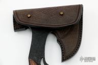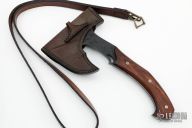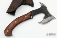 This San-Mai Hand Axe by the Sobral Brothers features a hammer mark finished black blade head with spike at the rear, stainless steel fittings, micarta liners wood scales. Full tang construction .286" stock and 1.70" blade depth. 5.25" from blade to tip of spike. 11.25" overall. Comes with a leather sheath with shoulder rig, updated sheath from Sobrals and a zippered case. New from Maker! Slight separation in the scales. Original two-piece sheath might be split, but is included.
