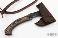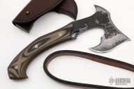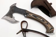 This San-Mai Hand Axe by the Sobral Brothers features a hammer mark finished black blade head with spike at the rear, stainless steel fittings, G10 scales. Full tang construction .286" stock and 1.70" blade depth. 5.25" from blade to tip of spike. 11.25" overall. Comes with a leather sheath with shoulder rig, updated sheath from Sobrals and a zippered case. New from Maker! Original two-piece sheath might be split, but is included.