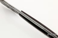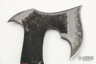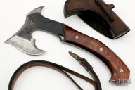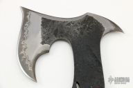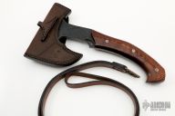 This San-Mai Hand Axe by the Sobral Brothers features a hammer mark finished black blade head with spike at the rear, stainless steel fittings, wood scales. Full tang construction .286" stock and 1.70" blade depth. 5.25" from blade to tip of spike. 11.25" overall. Comes with a leather sheath with shoulder rig, updated sheath from Sobrals and a zippered case. New from Maker! Original two-piece sheath might be split, but is included. Original two-piece sheath might be split, but is included.