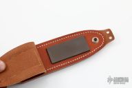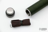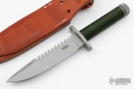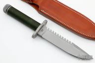 This survival knife by Vaughn Neeley features a bead blasted spear point blade with serrated top edge and 10 saw-teeth on blade spine. .247" blade stock and 1.341" blade depth, hidden tang construction. The handle has a bead blasted titanium double guard, hollow cord wrapped handle, and stainless steel removable butt cap with an O-ring to make it water-proof. Comes with brown leather sheath that has a leather flap with a snap covering a honing stone that is embedded in the sheath. Inside the handle is a roll-up kit with a fire stick, fishing hooks, splitshots and a single fly, and slots to hold other items. The cord that is around the handle is also one piece of cord that can be removed for survival use. The removable butt cap has a polished flat inside that can be used for signaling. The blade is marked "043SE" and "VN-0511". This knife was well thought out and provides everything possible for survival. Excellent condition.