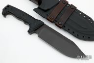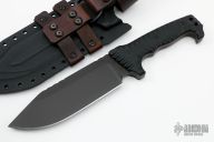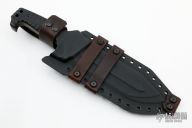 This Custom M-8 by Miller Bros Blades features a black clip point blade with notched thumbrest made from Z-Wear PM steel, .324" blade stock 2.322" blade depth, full tang construction. The handle has black G-10 scales with brown G-10 liners, notched tang top and bottom. lanyard holes at the butt. Comes with a kydex/leather sheath and COA dated 6-2018. New condition.