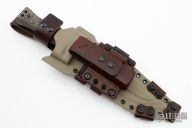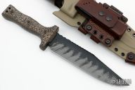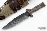 This Custom M-22 by Miller Bros Blades features a two-tone clip point blade with textured spine made from Z-Wear PM steel, .307" blade stock 1.966" blade depth, full tang construction. The handle has black/brown G-10 scales, lanyard holes at the butt. Comes with a kydex/leather sheath and COA dated 2020. New condition.