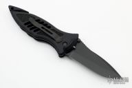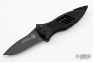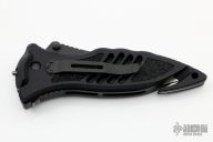 This CQD Mark 1 Auto from Masters of Defense has a spear point black blade with dual thumb studs. Handle is black aluminum with non-slip inserts, reversible black tip down clip, seat belt cutter, lanyard hole and glass breaker. Comes with original box, sheath and papers. Excellent condition.