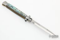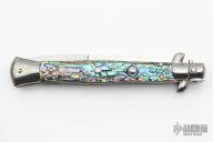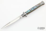 This 11" Picklock by Frank Beltrame features a polished blade with false top edge. The handle has stainless steel bolsters, front and rear, abalone scales, brass liners, stainless spring. Excellent condition.
