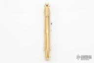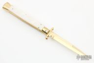This 11" Swing Guard Auto by Frank Beltrame features a gold plated bayonet ground blade with false top edge. The handle has gold plated stainless steel bolsters, front and rear, mother of pearl scales, brass liners, gold plated stainless spring. Excellent Condition.