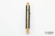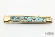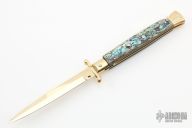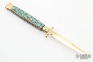 This 11" Swing Guard Auto by Frank Beltrame features a gold plated bayonet ground blade with false top edge. The handle has gold plated stainless steel bolsters, front and rear, abalone scales, brass liners, gold plated stainless spring. Excellent Condition.
