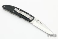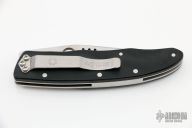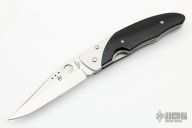 This Howard Viele designed Spyderco features a satin finished blade with notched thumbrest and thumbhole. Polished black micarta scales with stainless liners. Tip down stainless steel clip. Has a couple very light scratches, otherwise excellent condition. Comes with original box. #248