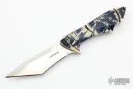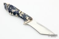 This Au Eli by Jerry Hossom features nicely shaped stabilized cross cut mammoth ivory scales with black micarta and mosaic pins. Hand rubbed satin finished blade with sharpened top edge and notched thumbrest, .154" blade stock and 1.134" blade depth, full tapered tang construction. Fits nicely in hand. Includes a zippered case. Excellent condition.