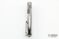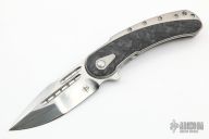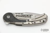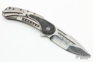 This Bodega Beggatti by Todd Begg Knives has a hand rub satin finished multi-ground spear point blade with notched thumbrest, satin flats, fullers and flipper, 1/4" blade stock. Has IKBS. The handle has 3/16" thick satin finished titanium frame with carbon fiber inlays, a titanium lockbar and tip up clip, 1/4" thick titanium backspacer with crosshatch jimping. Has nice detent, lockup and blade seating. Very smooth action. Excellent condition. Comes with original box and COA dated 11/12/18.