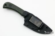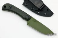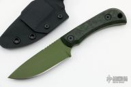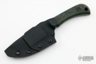 This Cav Jr by Half Face Blades features a green coated blade with a notched thumbrest, .165" blade stock, 1.229" blade depth, full tang construction.  The handle has green carbon fiber scales.  Comes with a kydex sheath with clip. Includes the original box and papers.  Excellent condition.