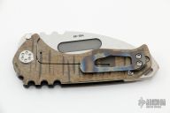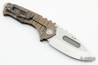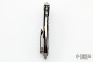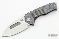 This Praetorian Genesis T by Medford Knife and Tool features a tumbled drop point style blade with fullers and notched thumbrest. The handle has a sculpted and anodized titanium frame with a flamed titanium tip up pocket clip and a D2 backspacer/glass breaker with lanyard bail.  Includes original box and vault style case. Excellent condition.