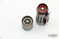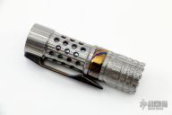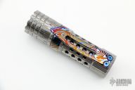This classy light from The Barrel Flashlight Company features a Damasteel body, and a MokuTi ring sleeve, and clip. From the makers site: Barrel Flashlight Co. flashlights are proudly made in USA. Our lights are turned from solid round bar. About 1000 lumens on high depending on LED’s selected Triple LED output with builds with Cree XP-L HI 5K. The “ pill “ that houses the LED’s and driver is machined from solid for optimum performance and heat transfer. Light measures 3.5 inches long and just under 1 inch in diameter. Light runs on an Efest high capacity 700mAh 16340 unprotected button top rechargeable IMR battery. Interchangeable barrel rings, barrels ( inner sleeve), clips, and screws to customize your light and ability to match your EDC. Light is built with one of the most advanced drivers on the market: the fully programmable H17F with battery monitoring. The H17F comes in a very user friendly set default of moonlight, low, medium, and high. Rear “ clicky “ button cycles light through modes. For the avid flashlight hobbyists , a secret hidden mode can be entered to program the light. Light is water resistant. Light tailstands very well. Comes with original packaging, and signed/dated certificate of authenticity dated 06/19. Excellent condition.