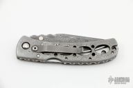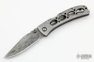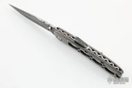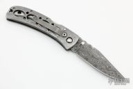 This Mid-Lock Folder by Phil Boguszewski features a Raindrop Stainless Damascus blade with a single thumbstud with blue stone inlay. The handle has a matching Raindrop Stainless Damascus frame with a fileworked stainless steel  backspacer, tip down titanium clip. Nice lockup and blade seating. Has a few light scuffs and scratches, otherwise excellent condition. #3