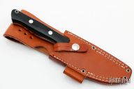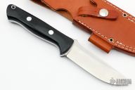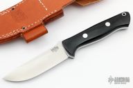 This Bravo-1 by Bark River Knives features a satin finished blade with notched thumbrest, .217" blade stock and 1.135" blade depth, full tang construction. The handle has black G-10 scales with lanyard hole. Comes with a brown leather sheath and original box. Excellent condition.