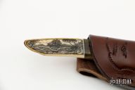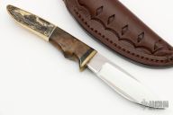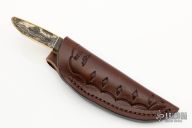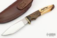 This knife by Chuck Stapel has a mirror polished blade with .155" blade stock and 1.074" blade depth, hidden tang construction. The handle has a brass guard, a walnut and walrus ivory grip with black linen micarta spacer. The walrus ivory has been scrimshawed on both sides. Comes with a hand tooled brown leather sheath. Excellent condition.