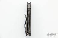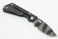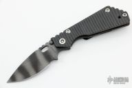 This PT by Mick Strider features a tiger stripe finish blade with notched thumbrest and thumbhole. The handle has a flame finished titanium frame with matching tip up clip. Has a scuff on the b-side fo the blade, otherwise excellent condition.