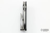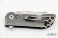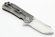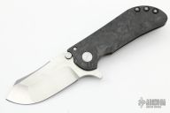 This M-8 flipper features satin finished blade with a notched thumbrest. The handle features a marbled carbon fiber and tumbled titanium frame with a matching tip up pocket clip. Includes the original box. Excellent Condition.