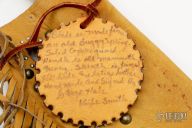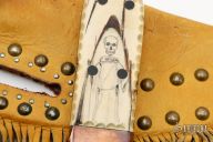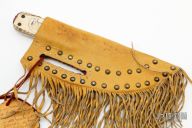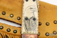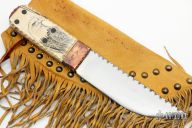 This Large Bowie by George Hale was forged from a buggy spring and is satin finished, fileworked spine, .210" blade stock and 1.953" blade depth, full tang construction. The handle has fileworked copper bolsters, mammoth ivory scales with scalloped edges and scrimshaw by K. Miller. Comes with a brown leather sheath with tassels. Has some light scratches, has come cracks in the scales, otherwise good condition. Comes with COA.
