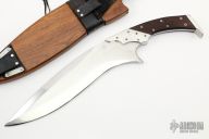This Large Fighter by Joe Knuth features a mirror finished blade with a false top edge, .307" blade stock and 2.909" blade depth, full tang construction. The handle has stainless steel bolsters and butt, checkered black linen micarta scales. Comes with a wooden scabbard with leather belt loop. Signed and dated 6/92 and #423 on the bolsters. Has some light scuffs and scratches, otherwise excellent condition.