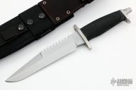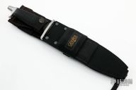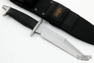 Hard to find sawtooth BMF by Gerber has been out of production for many years. Blade is bead blasted as are the guard and butt cap. .246" thick and 1.482" deep. Non-skid handle. Comes with original sheath. Has some oxidation on the guard and butt, otherwise excellent condition. Highly desirable tactical knife. #007018. Has original Silva compass and diamond sharpening stone.