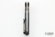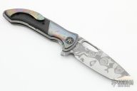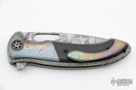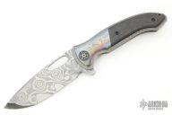 This Tatsu flipper by Eric Ochs features a Damacore blade with a thumbhole and flipper. The handle has a tumble finished titanium frame with mokuti and carbo quartz overlays, floating zircuti  backspacer, zirconium pivot collars, tip up mokuti clip with hidden screws. Nice detent, lock up and seating. Comes with a zippered case. Has a couple very light scratches, otherwise excellent condition.