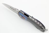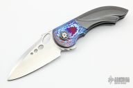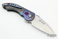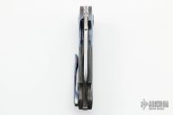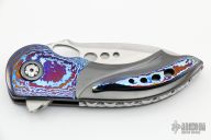 This Linerlock flipper by Alistair Bastian features a hand rub satin finished blade with fileworked spine, thumbhole and flipper. The handle has fluted timascus bolsters, carved zirconium scales, anodized titanium liners, tip up timascus clip, zirconium pivot collars, polished and fileworked stainless steel 2-piece backspacer. Comes with a zippered case. #219 inside backspacer. Rides on caged bearings. Nice detent, lockup and blade seating. Very nice piece for any collection. Excellent condition.