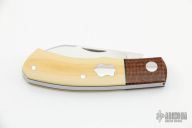This Dino by Willem Steenkamp features a hand rub satin finished blade with nail nick. The handle has Thunderstorm Kevlar bolsters, Westinghouse paper micarta covers with a stainless steel escutcheon and jeweled liners, black spacers/liners, stainless steel spring. Has half-stop, flush in all positions. Excellent condition. Comes with a zippered case.