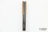 This Slipjoint by Chuck Gedraitis features a Damascus blade. The handle has brass carved bolsters, faux tortoise shell covers, anodized and fileworked titanium liners, fileworked and blued steel spring. Has a double detent system. Comes with a zippered case. Has some light scratches and patina, otherwise excellent condition.