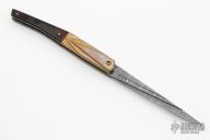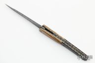 "Ever since I can remember I have had a fascination with knives. My grandfather gave me my first pocketknife when I was 5, and it was that moment that did it. I started making knives by taking apart my mothers kitchen knives. My parents thought that there was something "wrong" with me because I had a fascination with sharp objects. That all changed when I took them to a local knife show and showed them a whole room of people interested in knives. I seriously began making knives when I was 16. I have been making knives for over 25 years. For the past 10 years I have mainly concentrated on making folding knives and automatics. I mainly concentrate on making one-of-a-kind folding knives of my own design, but I do occasionally make a few fixed blades. I specialize in unique file work patterns, and I also do simple carving and some of my own sheath work. For steels I mostly use Damascus, but also use 154CM, CPM154, D-2, 1095, W-2 and others. Handle materials include Exotic Woods, Stag, Pearl, and various types of Ivories including Elephant, Mammoth, and Walrus. As far as knife builds go, I think I am going to concentrate on building more elaborate autos as well as converting some of my older designs into autos. I appreciate the challenge of making an auto, and it keeps knife making exciting for me.”