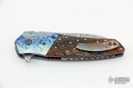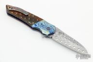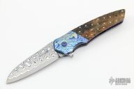 This Bolide Flipper from Mike Zscherny (Scorpion Knives) and Faisal Yamin features a Sheepsfoot blade with swedge fashioned from San Mai Damascus. The spine of the blade features three 14k gold pins that have been carefully set into the San Mai. The handle has timascus bolsters, checkered mammoth ivory scales with 14kt gold pins, fileworked and anodized titanium liners, San Mai Damascus backspacer, timascus tip up clip. Rides on bearings, nice detent, lockup and blade seating. Excellent condition. Comes with a zippered case.