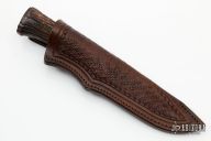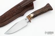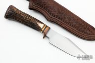 This Hunter by Denis Mura features a hand rub satin finished blade with a nearly sharpened top edge and notched thumbrest, .178" blade stock and 1.480" blade depth, hidden tang construction. The handle has a copper guard, stag grip with black/brass spacers, brass infused carbon fiber butt with a red spacer. Comes with a hand tooled brown leather sheath by Kiara. Excellent condition.