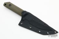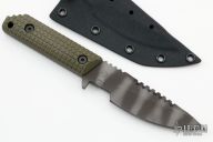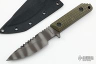 This HT-S by Strider Knives features a tiger striped spear point blade with a notched thumbrest and a full tang construction. .208" Blade Stock, 1.487" Blade Depth.  The handle features green frag pattern G-10 scales. Comes with a kydex sheath. Excellent Condition.