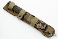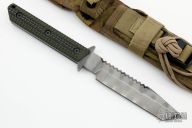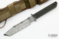 This BTSS from Mick Strider features a tiger stripe clip point tanto style blade with serrations on the spine, .255" blade stock and 1.308" blade depth. The handle is comprised of green/black frag pattern G-10 scales over full tang construction with a lanyard hole. Includes nylon sheath with belt loop. Has some scuffs, otherwise excellent condition.