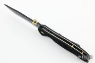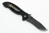 This Order of the Black Shamrock by Emerson knives is #982, it features a black blade with notched thumbrest, upgraded anodized titanium Shamrock thumbdisc and wave feature. The handle has black G-10 scales, titanium liners, upgraded anodized titanium standoffs and pivot, tip up Steel Flame Crusader clip. Comes with original box, papers and original hardware. Excellent condition.