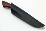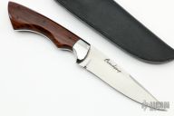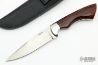 This piece by Gaetan Beauchamp features a hand rub satin finished blade with false top edge, .129" blade stock and 1.183" blade depth, full tang construction. The handle has dovetailed mirror polished stainless bolsters, cocobolo scales with black canvas micarta liners. Nicely contoured handle. Comes with a black leather sheath. Excellent condition.