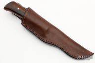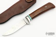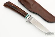 This Integral Drop Point Hunter by Boye features a drop point blade with an integral guard, .212" blade stock and .921" blade depth at the plunge line, hidden tang construction. The handle has an ironwood grip with single pin, black/brass/turquoise spacers. Etching on blade was done by Francine. Comes with a brown leather sheath. This rare piece is excellent condition.