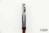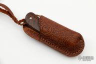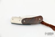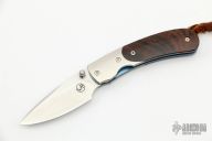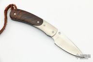 The knife has a hand rub satin finish blade, satin titanium bolsters, and ironwood scales. Includes original box, pouch, and paperwork. Has a few light scratches, otherwise excellent condition.