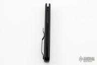 This knife features a black sterile blade.  The handle has a black aluminum frame with black hardware and black stainless steel tip up clip.  There is a lantern inlaid into the push button.  Comes with original box and papers. Excellent condition.