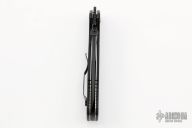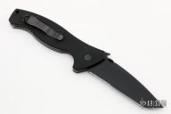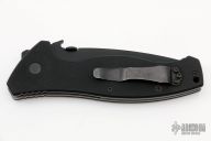 This production Super SOCFK linerlock folder has a black chisel ground tanto partially serrated blade and G10 scales, titanium liners, and a black tip up clip. Wave feature. Excellent condition. #0298.
