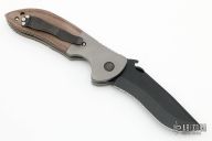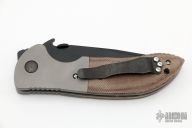 This PoBoy Commander from Emerson Knives features a black recurve partially serrated blade with knurled titanium thumbdisc and wave feature. The handle has bead blasted and dovetailed titanium bolsters, natural canvas micarta scales, titanium liners and a tip up titanium clip. Comes with a zippered case. Excellent condition. Comes with original black G-10 scales and screws.