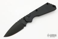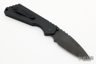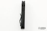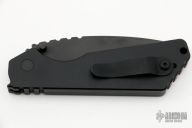 This Pro-Strider SNG by Pro-Tech and Strider Knives features a black blade with notched thumbrest. The handle has a black aluminum frame with black hardware and black stainless steel tip up clip.  There is a tritium lantern inlaid into the push button. Comes with original box and papers.