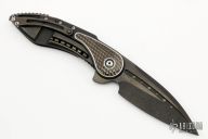 This Glimpse 5.5 Prototype #1 from Begg Knives features a tumbled DLC coated blade with false top edge and cracked ice finish on blade spine and flipper. The handle is comprised of machined and DLC coated titanium scale with titanium tip down pocket clip and machined titanium backspacer. Great blade seating, detent and lock up. Includes original box and COA. Excellent condition.