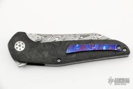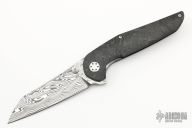 This Progeny features a Damasteel sheepsfoot style blade with dual thumb studs and a notched flipper.  The handle features marbled carbon fiber scales with a Timascus backspacer and a matching tip up pocket clip. Includes the original box.  Excellent Condition.