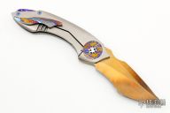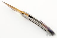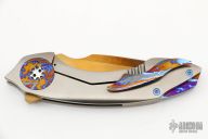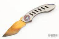 This knife by Savkov Knife Co. features an SM-100 blade with heat treat finish, flipper and false top edge. The handle has a bead blasted titanium frame, zircuti pivot collars, backspacer and tip up clip. anodized titanium hardware. Rides on bearings, nice detent, lockup and blade seating. Comes with a zippered case. Excellent condition.