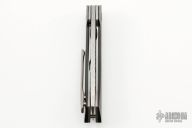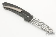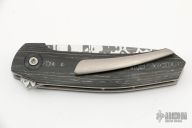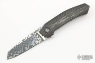 This Full Custom by Tapio Syrjälä features an in-house forged stainless Damascus blade with a flipper. The handle has carbon fiber scales, satin titanium liners, tip up titanium clip with hidden screws. Very impressive work. Rides on ceramic bearings, nice detent, lockup and blade seating. Has some scratches, otherwise excellent condition.