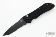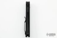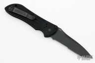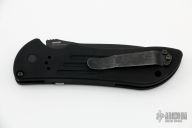 This 9101SBK AUTO Stryker from Benchmade features a black coated drop point tanto style blade with swedge, notched thumb rest and partial serrations. The handle is comprised of milled black aluminum frame with a black coated stainless steel tip up clip. Safety on backspacer and lanyard hole in pommel. Excellent condition. Comes with original box and papers.