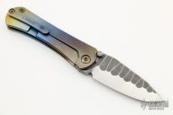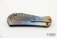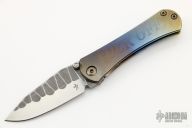 This SBDP by Borka Blades features a satin finished blade with Borka pattern flats, dual thumbstuds. The handle has a stonewashed and anodized titanium frame with a matching tip up clip. Nice detent, lockup and blade seating. Comes with zippered case, COA. Dated 2021.  Excellent condition.