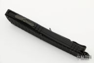 The Combat Troodon is a precision-made, out-the-front tactical knife. It is 25% larger than the flagship, the Troodon. It brings the slender handle, contoured shape, radical design elements, and a sophisticated internal mechanism that improves operational functionality and reliability to a larger scale. The Combat Troodon is designed for a broad spectrum of utility and close quarter combat applications. Has a fluted DLC standard tanto blade. Black frag pattern aluminum handle with black hardware, tip down stainless steel clip and nickel boron internals. Comes with original box and papers. Excellent condition. Dated 06/2021 and S/N 266.
