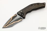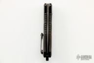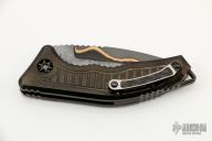 This Medusa by Heretic Knives features a Baker Forge Damascus recurve blade with a notched thumbrest.  The handle features a DLC coated frag pattern frame with a matching backspacer.  The push button and titanium tip up pocket clip both have a Snakeskin Fat Carbon inlay.  Includes the original box and papers.  S/N 021.  Excellent Condition.
